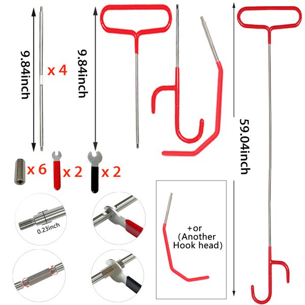 It consists of 7 parts -9.84"" (~25cm) handle rod, 9.84"" (~25cm) double U hook, 9.84"" (~25cm) hook rod and 4 9.84"" (~25cm) extension rod, which can reach 59.04"" (~150cm) when assembled. It can be assembled into 3 sizes according to different needs. 1. Non-slip soft rubber handle protection and groove design for easy assembly and disassembly, lengthening the rubber position of the hook head, without worrying about damage to the car paint.