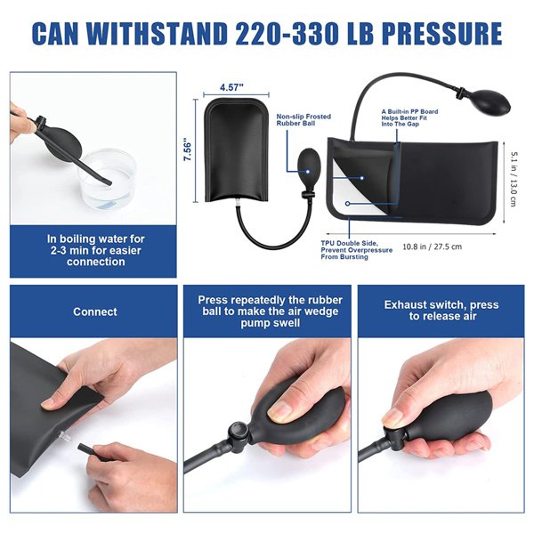 Made of high quality TPU material. Rounded corners, hard durable edges, smooth exterior, with a hard PVC sheet in the middle, easier to insert to resist greater pressure. A simple squeeze pump and precise bleed valve help you lift and lower into perfect position. Inflatable airbags are suitable for Windows, doors, cabinet installations, appliances and plumbing. Caution: Do not overinflate to avoid damaging the airbag.