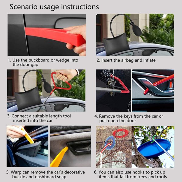 General Motors' Emergency Kit for car door and home window adjustment, an emergency door opening aid. It's very effective. Will not damage your vehicle. Or it is a long-distance hook that can be used in emergencies if an item is hung on a tree, on a roof, or falls into a river. Professional kits for cars and trucks, each designed to be flexible and easy to operate, get the job done in minutes. Suitable for all vehicle types. It will not cause damage or leave any scratches.